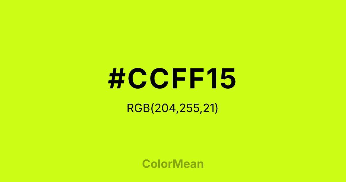 #CCFF15 RGB value is (204, 255, 21). The hex color red value is 204, green is 255, and blue is 21. Its HSL format shows a hue of 73°, saturation of 100 percent, and lightness of 54 percent. The CMYK process values are 20 percent, 0 percent, 92 percent, 0 percent.