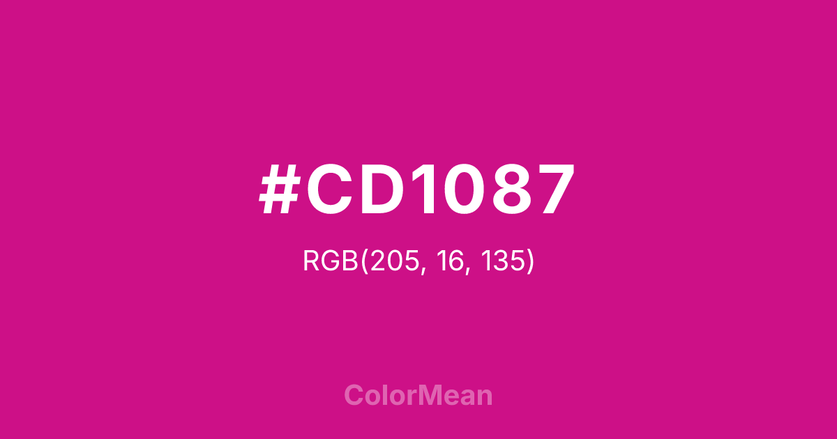 #CD1087 RGB value is (205, 16, 135). The hex color red value is 205, green is 16, and blue is 135. Its HSL format shows a hue of 322°, saturation of 86 percent, and lightness of 43 percent. The CMYK process values are 0 percent, 92 percent, 34 percent, 20 percent.