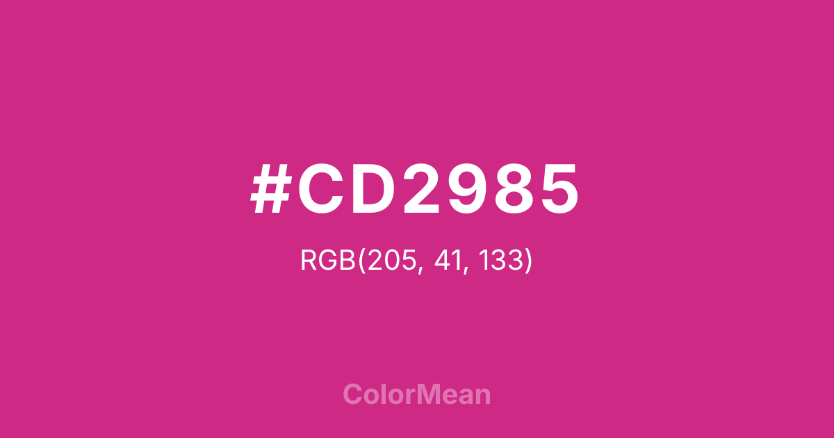 #CD2985 RGB value is (205, 41, 133). The hex color red value is 205, green is 41, and blue is 133. Its HSL format shows a hue of 326°, saturation of 67 percent, and lightness of 48 percent. The CMYK process values are 0 percent, 80 percent, 35 percent, 20 percent.