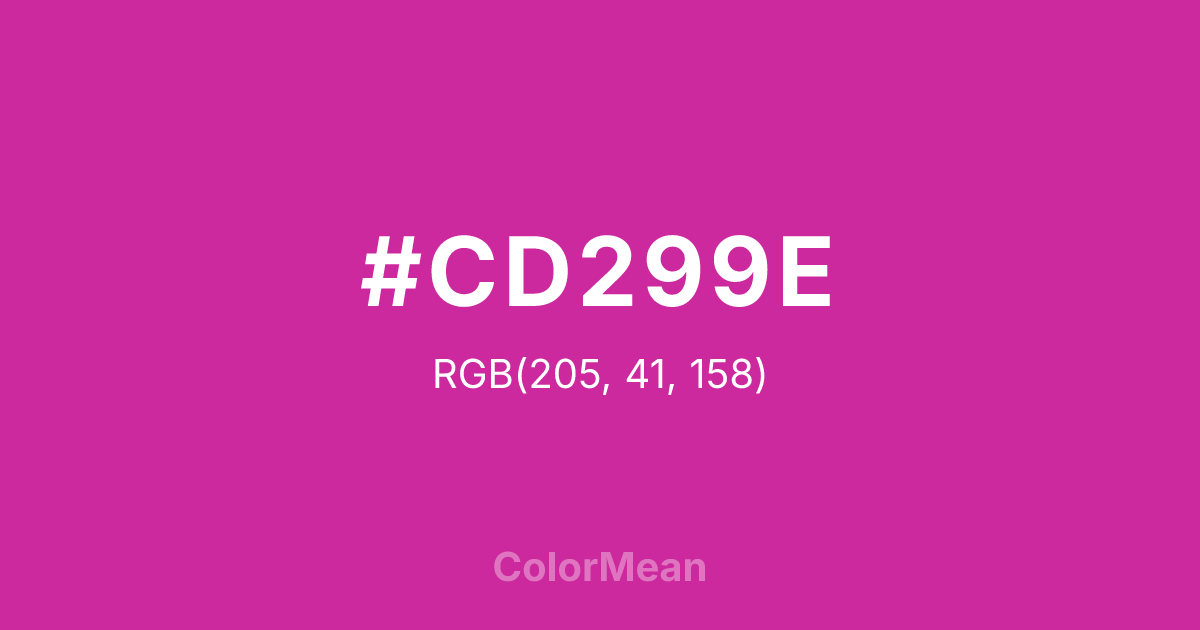 #CD299E RGB value is (205, 41, 158). The hex color red value is 205, green is 41, and blue is 158. Its HSL format shows a hue of 317°, saturation of 67 percent, and lightness of 48 percent. The CMYK process values are 0 percent, 80 percent, 23 percent, 20 percent.