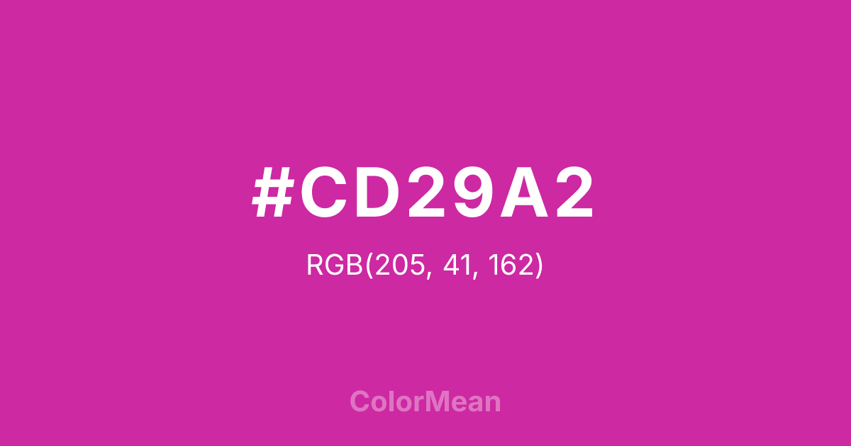 #CD29A2 RGB value is (205, 41, 162). The hex color red value is 205, green is 41, and blue is 162. Its HSL format shows a hue of 316°, saturation of 67 percent, and lightness of 48 percent. The CMYK process values are 0 percent, 80 percent, 21 percent, 20 percent.