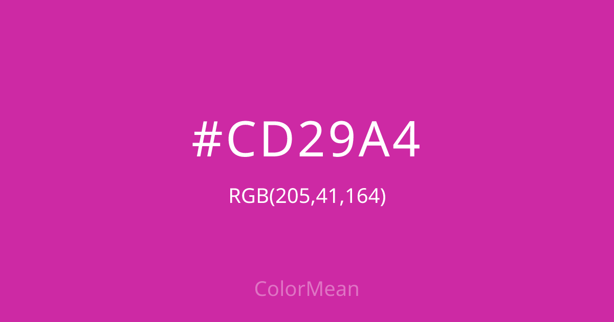 #CD29A4 RGB value is (205, 41, 164). The hex color red value is 205, green is 41, and blue is 164. Its HSL format shows a hue of 315°, saturation of 67 percent, and lightness of 48 percent. The CMYK process values are 0 percent, 80 percent, 20 percent, 20 percent.
