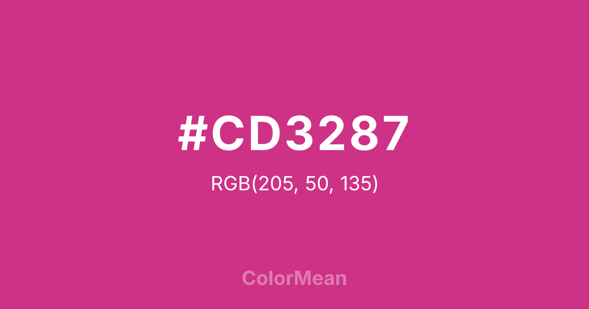 #CD3287 RGB value is (205, 50, 135). The hex color red value is 205, green is 50, and blue is 135. Its HSL format shows a hue of 327°, saturation of 61 percent, and lightness of 50 percent. The CMYK process values are 0 percent, 76 percent, 34 percent, 20 percent.