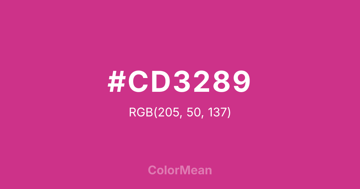 #CD3289 RGB value is (205, 50, 137). The hex color red value is 205, green is 50, and blue is 137. Its HSL format shows a hue of 326°, saturation of 61 percent, and lightness of 50 percent. The CMYK process values are 0 percent, 76 percent, 33 percent, 20 percent.