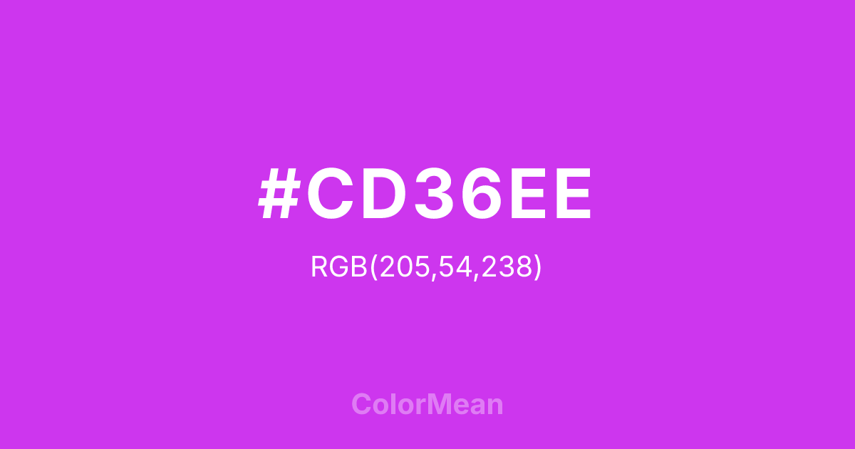#CD36EE RGB value is (205, 54, 238). The hex color red value is 205, green is 54, and blue is 238. Its HSL format shows a hue of 289°, saturation of 84 percent, and lightness of 57 percent. The CMYK process values are 14 percent, 77 percent, 0 percent, 7 percent.
