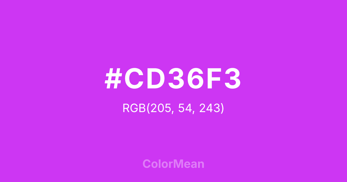 #CD36F3 RGB value is (205, 54, 243). The hex color red value is 205, green is 54, and blue is 243. Its HSL format shows a hue of 288°, saturation of 89 percent, and lightness of 58 percent. The CMYK process values are 16 percent, 78 percent, 0 percent, 5 percent.