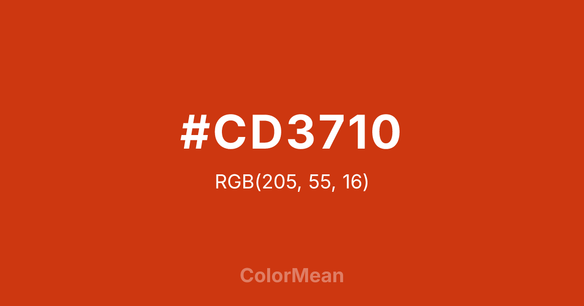 #CD3710 RGB value is (205, 55, 16). The hex color red value is 205, green is 55, and blue is 16. Its HSL format shows a hue of 12°, saturation of 86 percent, and lightness of 43 percent. The CMYK process values are 0 percent, 73 percent, 92 percent, 20 percent.