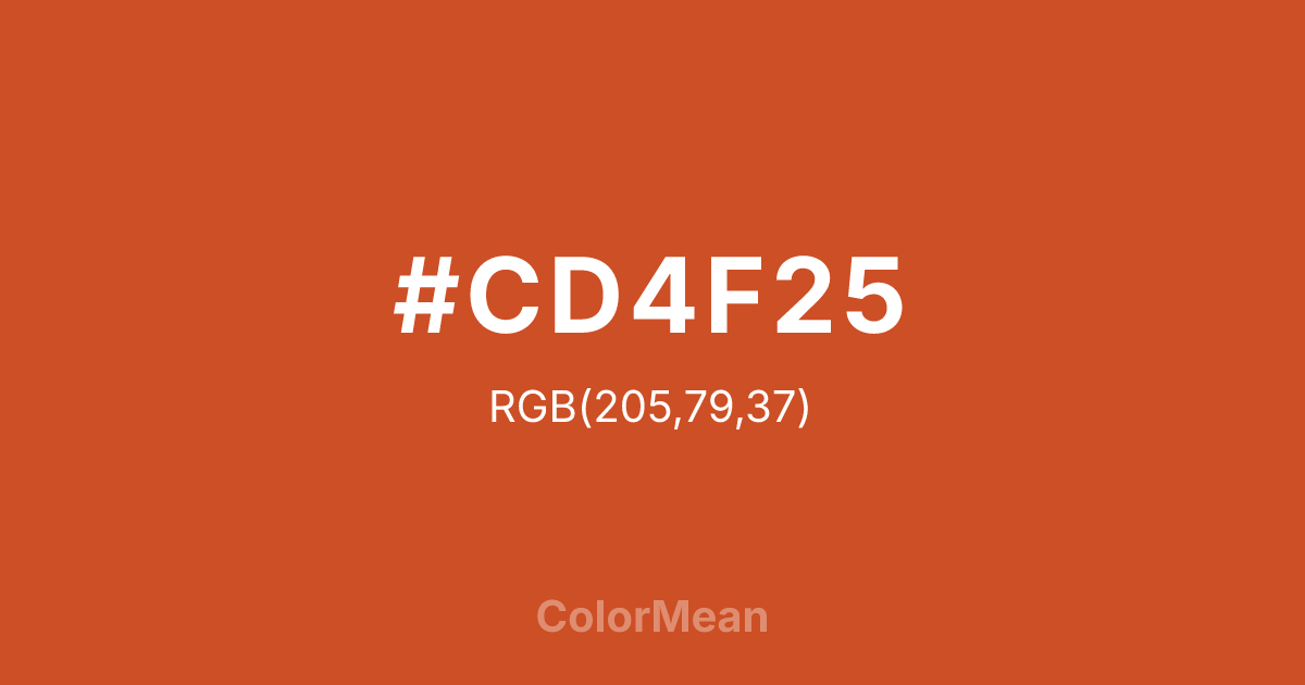 #CD4F25 RGB value is (205, 79, 37). The hex color red value is 205, green is 79, and blue is 37. Its HSL format shows a hue of 15°, saturation of 69 percent, and lightness of 47 percent. The CMYK process values are 0 percent, 61 percent, 82 percent, 20 percent.