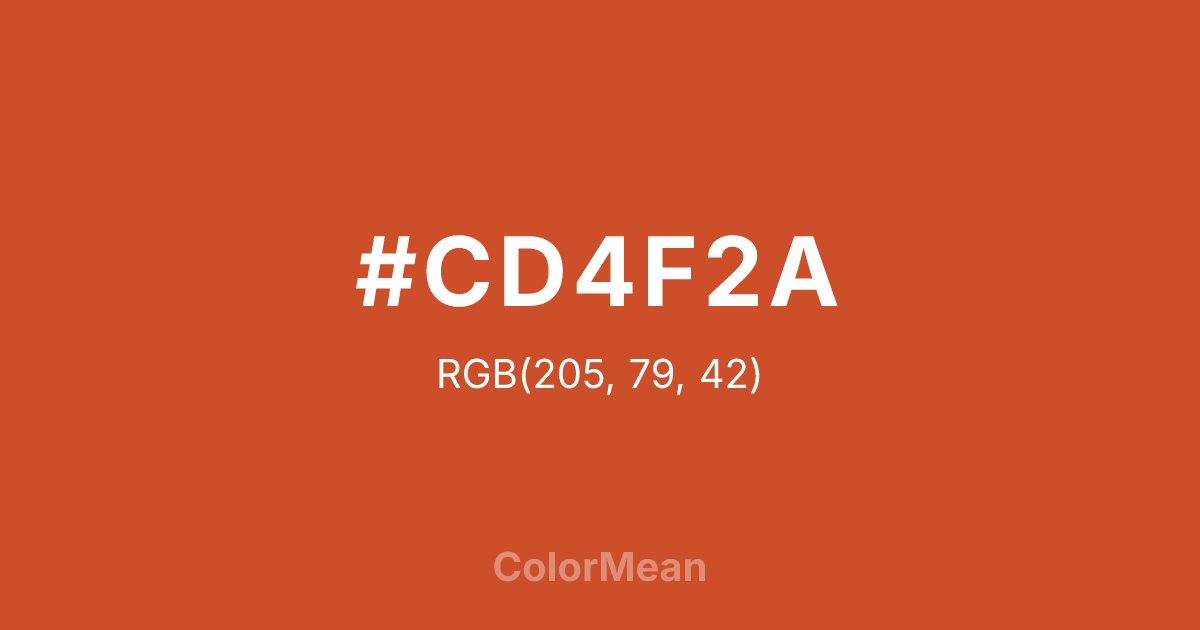 #CD4F2A RGB value is (205, 79, 42). The hex color red value is 205, green is 79, and blue is 42. Its HSL format shows a hue of 14°, saturation of 66 percent, and lightness of 48 percent. The CMYK process values are 0 percent, 61 percent, 80 percent, 20 percent.