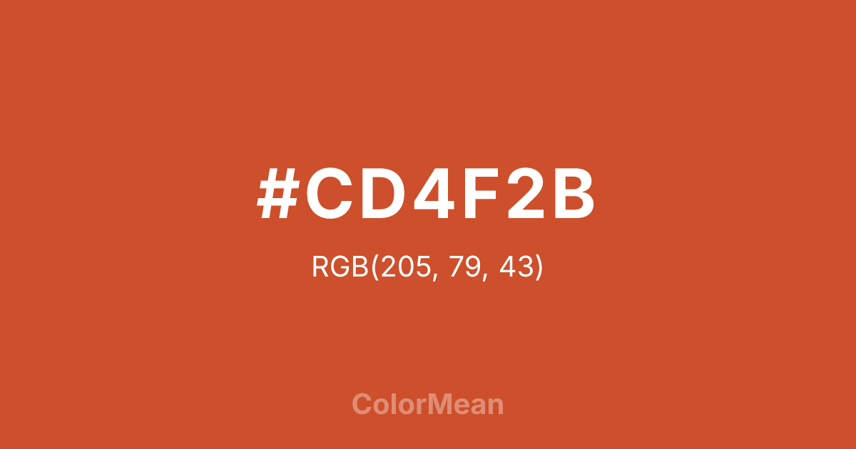 #CD4F2B RGB value is (205, 79, 43). The hex color red value is 205, green is 79, and blue is 43. Its HSL format shows a hue of 13°, saturation of 65 percent, and lightness of 49 percent. The CMYK process values are 0 percent, 61 percent, 79 percent, 20 percent.