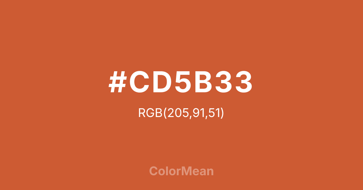 #CD5B33 RGB value is (205, 91, 51). The hex color red value is 205, green is 91, and blue is 51. Its HSL format shows a hue of 16°, saturation of 61 percent, and lightness of 50 percent. The CMYK process values are 0 percent, 56 percent, 75 percent, 20 percent.
