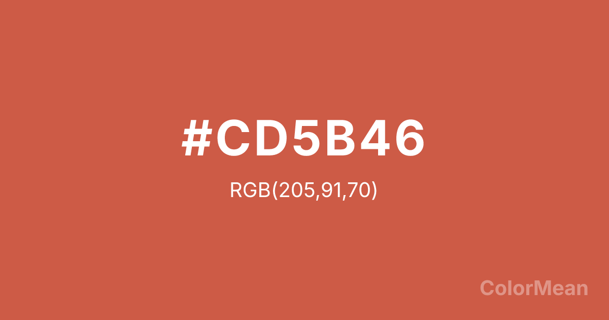#CD5B46 RGB value is (205, 91, 70). The hex color red value is 205, green is 91, and blue is 70. Its HSL format shows a hue of 9°, saturation of 57 percent, and lightness of 54 percent. The CMYK process values are 0 percent, 56 percent, 66 percent, 20 percent.
