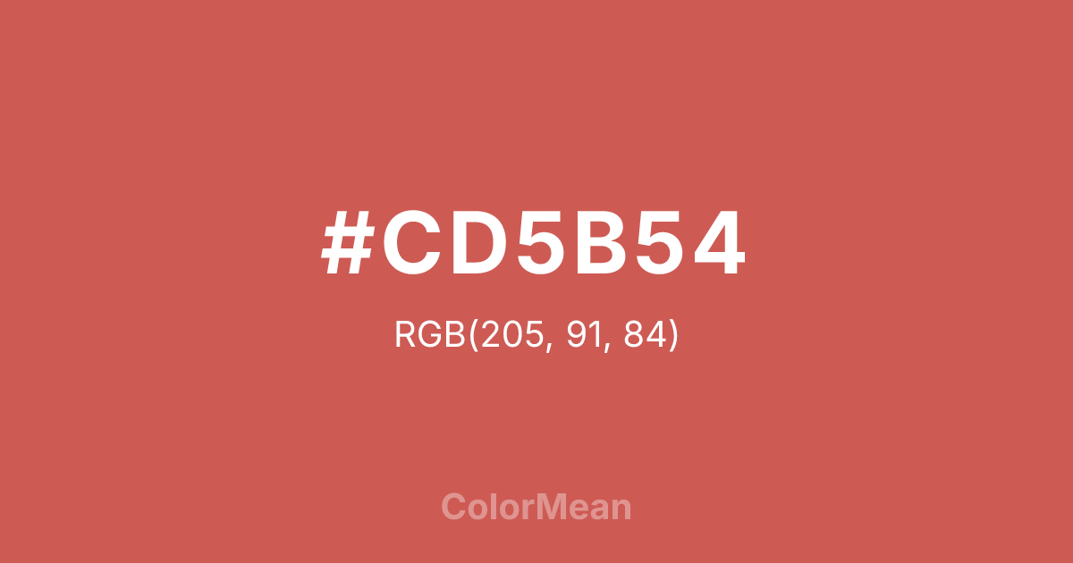 #CD5B54 RGB value is (205, 91, 84). The hex color red value is 205, green is 91, and blue is 84. Its HSL format shows a hue of 3°, saturation of 55 percent, and lightness of 57 percent. The CMYK process values are 0 percent, 56 percent, 59 percent, 20 percent.