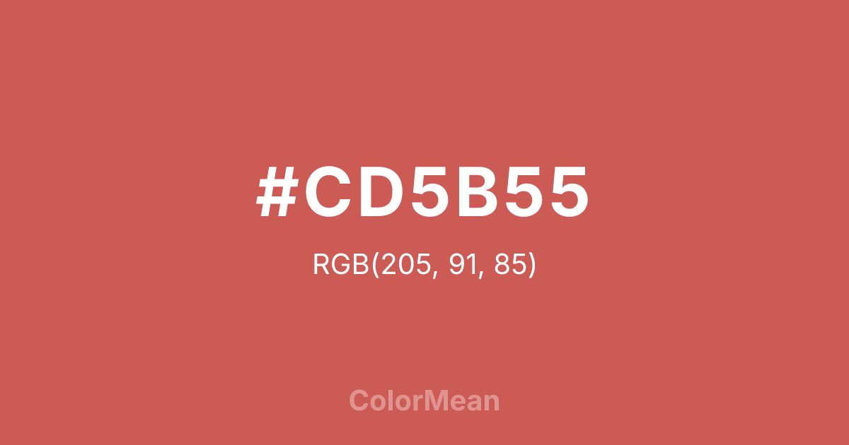 #CD5B55 RGB value is (205, 91, 85). The hex color red value is 205, green is 91, and blue is 85. Its HSL format shows a hue of 3°, saturation of 55 percent, and lightness of 57 percent. The CMYK process values are 0 percent, 56 percent, 59 percent, 20 percent.