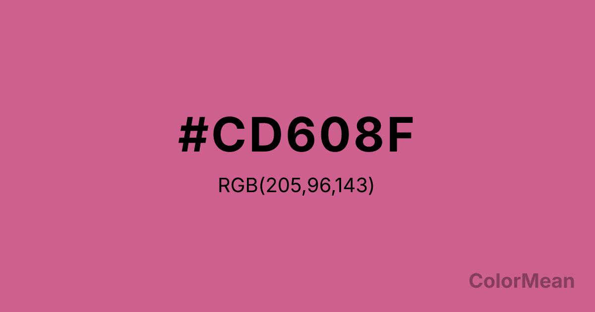 #CD608F RGB value is (205, 96, 143). The hex color red value is 205, green is 96, and blue is 143. Its HSL format shows a hue of 334°, saturation of 52 percent, and lightness of 59 percent. The CMYK process values are 0 percent, 53 percent, 30 percent, 20 percent.