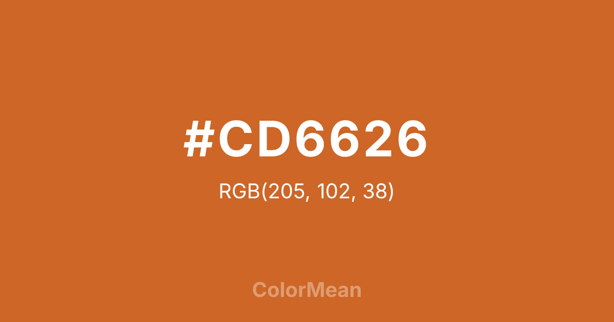 #CD6626 RGB value is (205, 102, 38). The hex color red value is 205, green is 102, and blue is 38. Its HSL format shows a hue of 23°, saturation of 69 percent, and lightness of 48 percent. The CMYK process values are 0 percent, 50 percent, 81 percent, 20 percent.