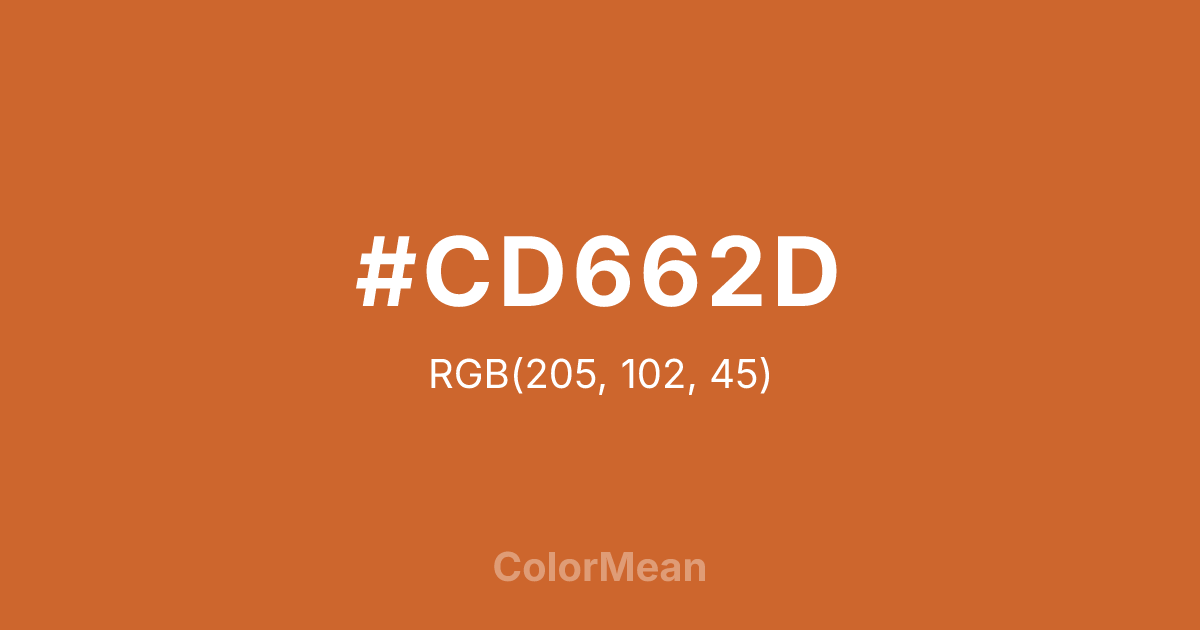 #CD662D RGB value is (205, 102, 45). The hex color red value is 205, green is 102, and blue is 45. Its HSL format shows a hue of 21°, saturation of 64 percent, and lightness of 49 percent. The CMYK process values are 0 percent, 50 percent, 78 percent, 20 percent.