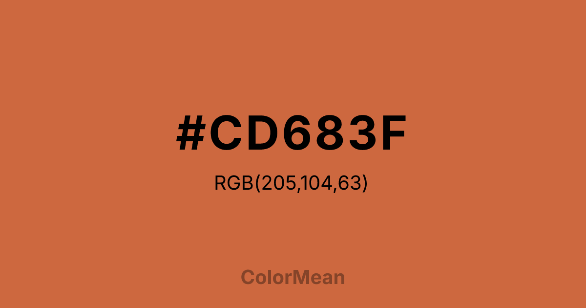 #CD683F RGB value is (205, 104, 63). The hex color red value is 205, green is 104, and blue is 63. Its HSL format shows a hue of 17°, saturation of 59 percent, and lightness of 53 percent. The CMYK process values are 0 percent, 49 percent, 69 percent, 20 percent.
