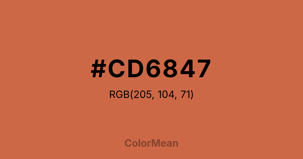 #CD6847 RGB value is (205, 104, 71). The hex color red value is 205, green is 104, and blue is 71. Its HSL format shows a hue of 15°, saturation of 57 percent, and lightness of 54 percent. The CMYK process values are 0 percent, 49 percent, 65 percent, 20 percent.