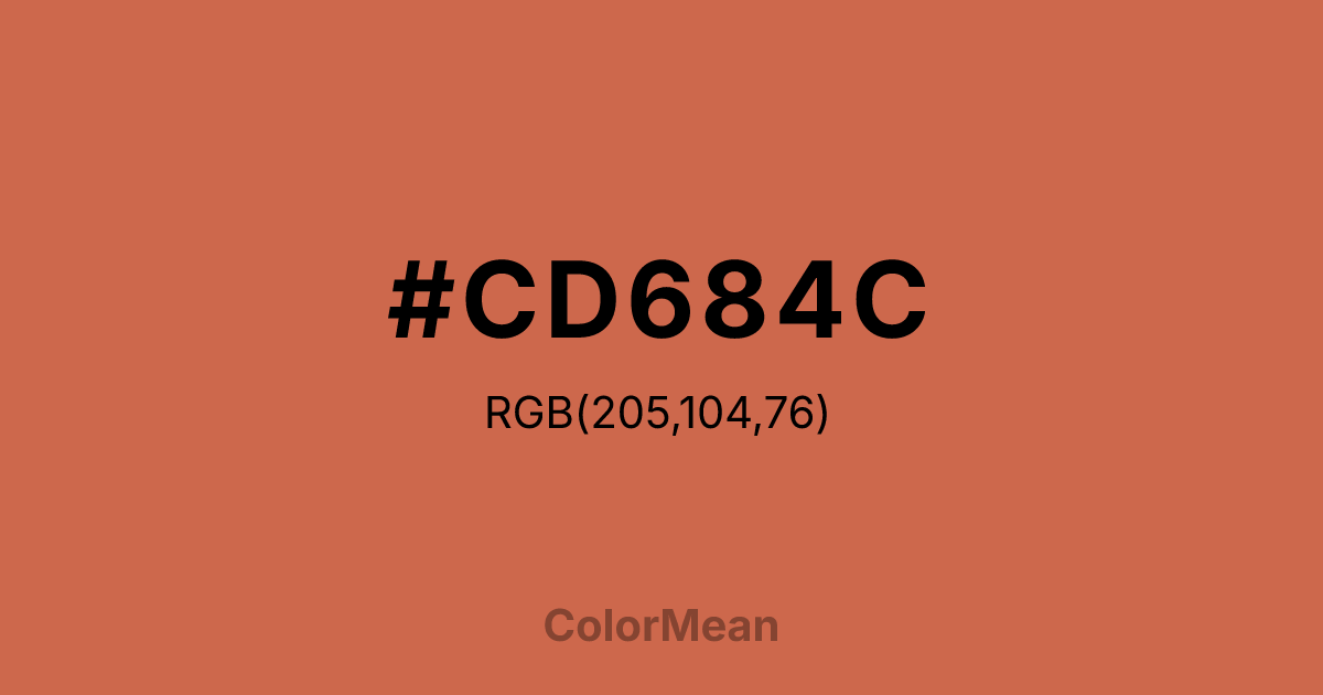 #CD684C RGB value is (205, 104, 76). The hex color red value is 205, green is 104, and blue is 76. Its HSL format shows a hue of 13°, saturation of 56 percent, and lightness of 55 percent. The CMYK process values are 0 percent, 49 percent, 63 percent, 20 percent.