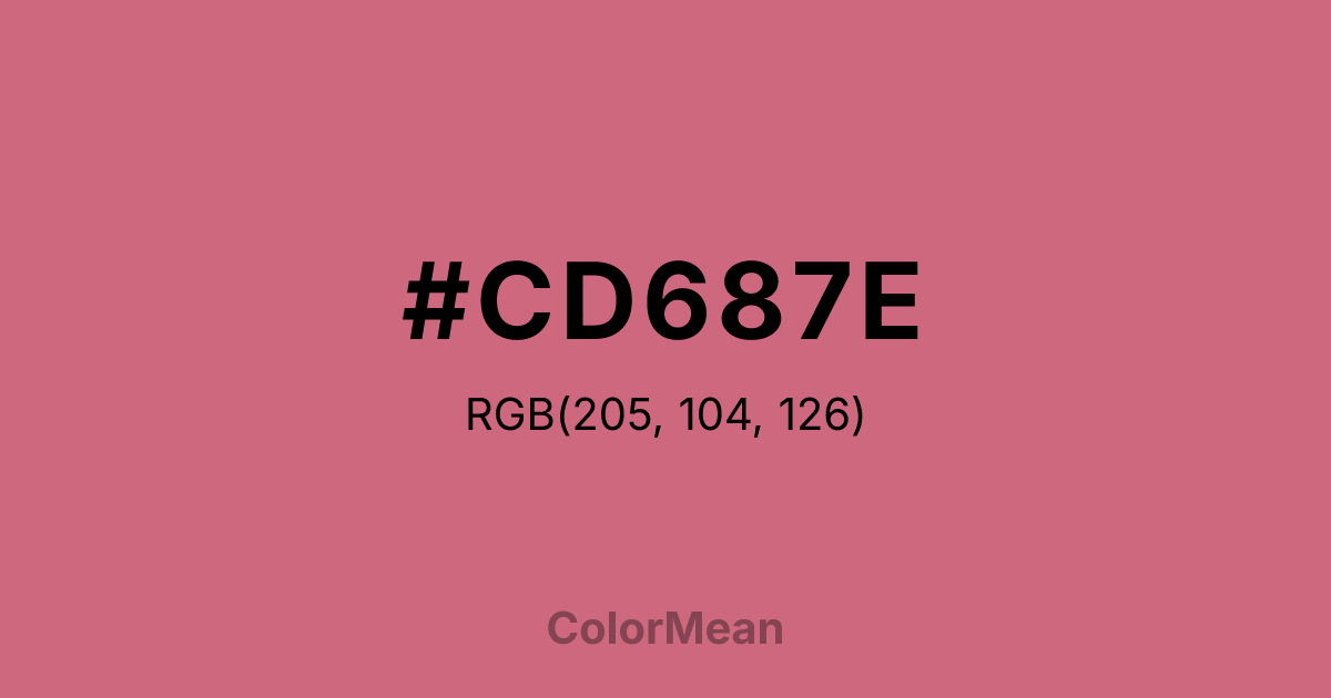 #CD687E RGB value is (205, 104, 126). The hex color red value is 205, green is 104, and blue is 126. Its HSL format shows a hue of 347°, saturation of 50 percent, and lightness of 61 percent. The CMYK process values are 0 percent, 49 percent, 39 percent, 20 percent.