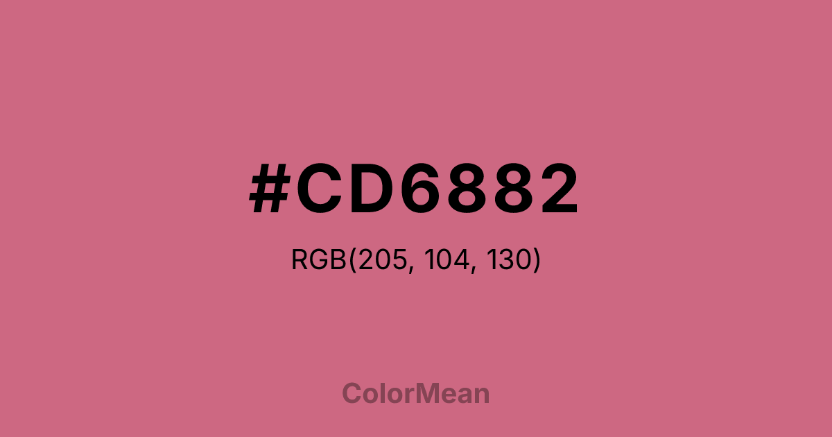 #CD6882 RGB value is (205, 104, 130). The hex color red value is 205, green is 104, and blue is 130. Its HSL format shows a hue of 345°, saturation of 50 percent, and lightness of 61 percent. The CMYK process values are 0 percent, 49 percent, 37 percent, 20 percent.