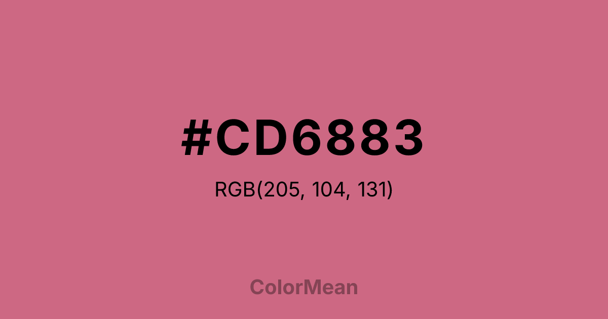 #CD6883 RGB value is (205, 104, 131). The hex color red value is 205, green is 104, and blue is 131. Its HSL format shows a hue of 344°, saturation of 50 percent, and lightness of 61 percent. The CMYK process values are 0 percent, 49 percent, 36 percent, 20 percent.