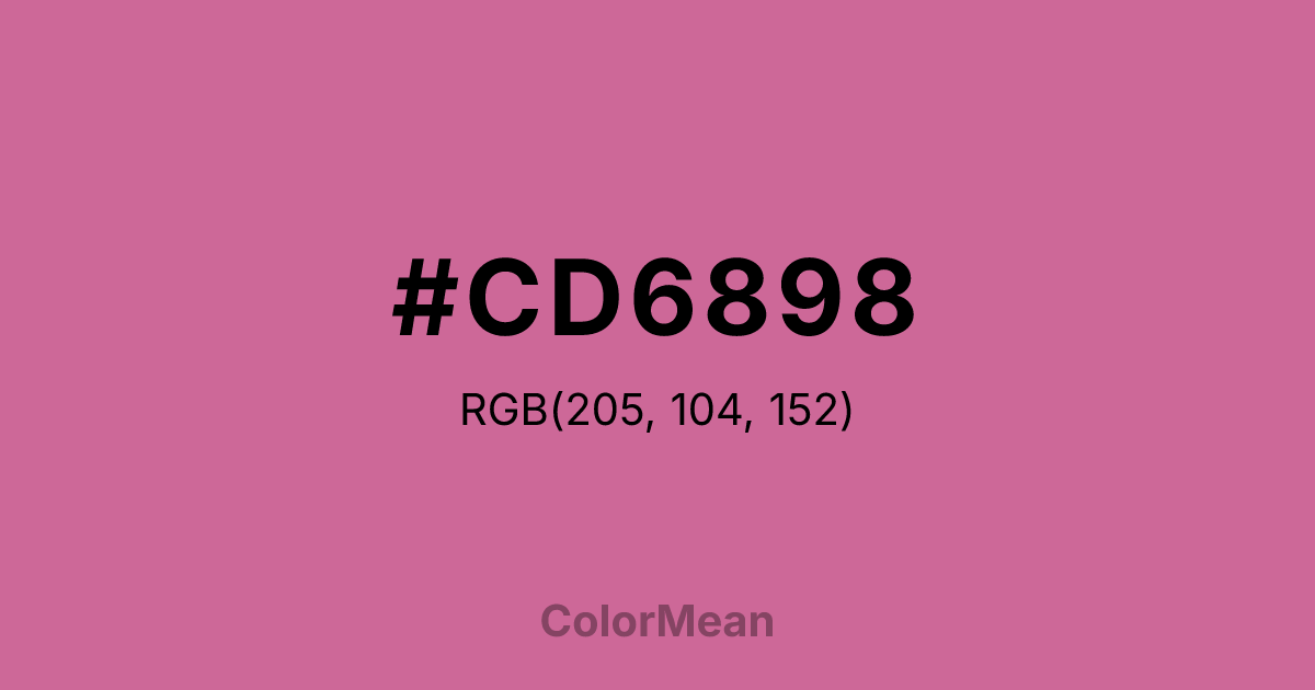 #CD6898 RGB value is (205, 104, 152). The hex color red value is 205, green is 104, and blue is 152. Its HSL format shows a hue of 331°, saturation of 50 percent, and lightness of 61 percent. The CMYK process values are 0 percent, 49 percent, 26 percent, 20 percent.