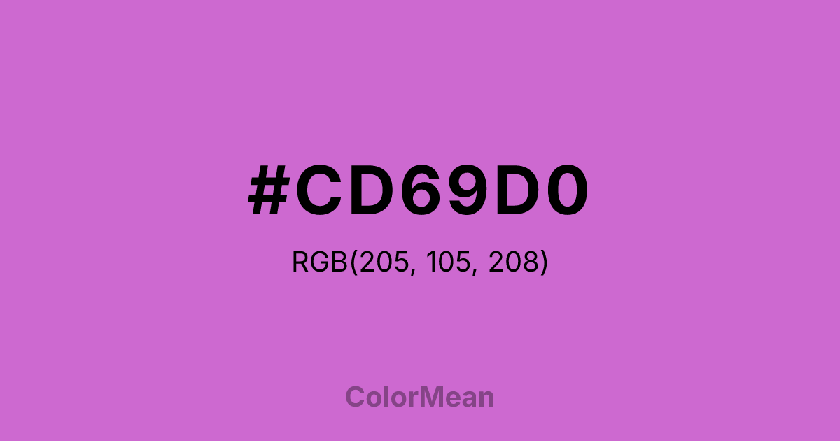 #CD69D0 RGB value is (205, 105, 208). The hex color red value is 205, green is 105, and blue is 208. Its HSL format shows a hue of 298°, saturation of 52 percent, and lightness of 61 percent. The CMYK process values are 1 percent, 50 percent, 0 percent, 18 percent.