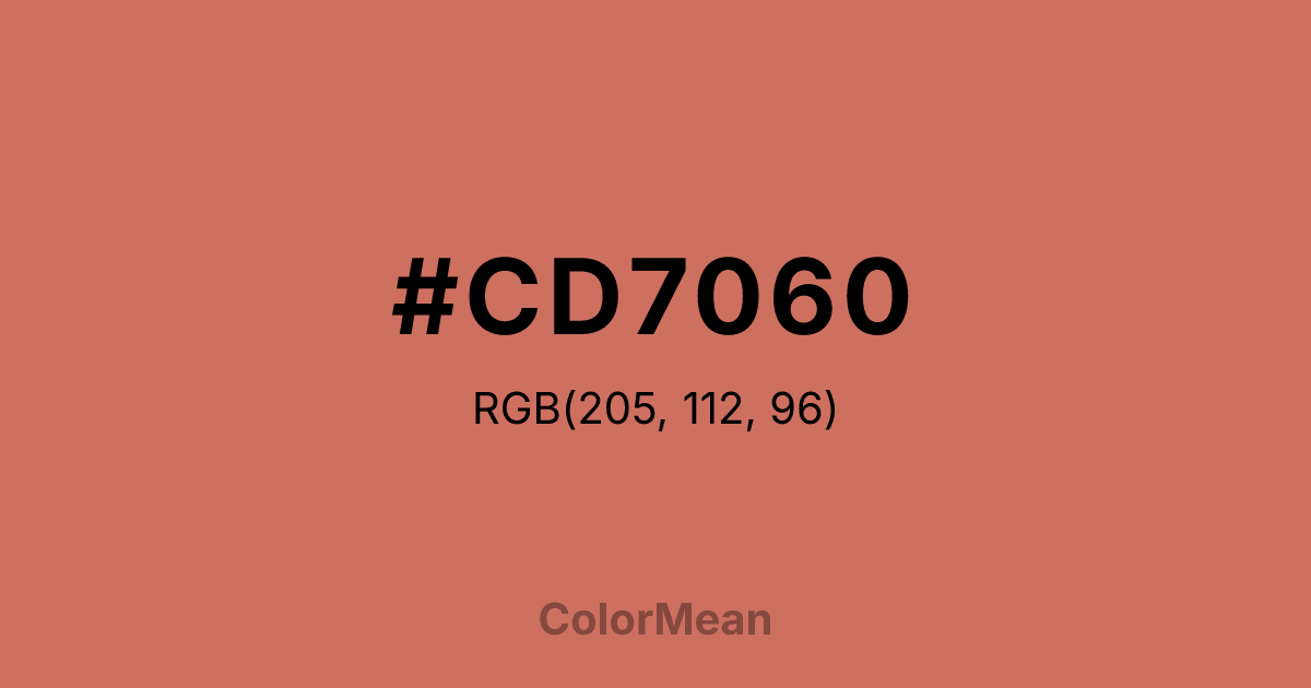 #CD7060 RGB value is (205, 112, 96). The hex color red value is 205, green is 112, and blue is 96. Its HSL format shows a hue of 9°, saturation of 52 percent, and lightness of 59 percent. The CMYK process values are 0 percent, 45 percent, 53 percent, 20 percent.