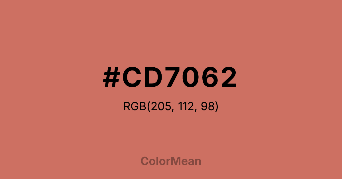 #CD7062 RGB value is (205, 112, 98). The hex color red value is 205, green is 112, and blue is 98. Its HSL format shows a hue of 8°, saturation of 52 percent, and lightness of 59 percent. The CMYK process values are 0 percent, 45 percent, 52 percent, 20 percent.