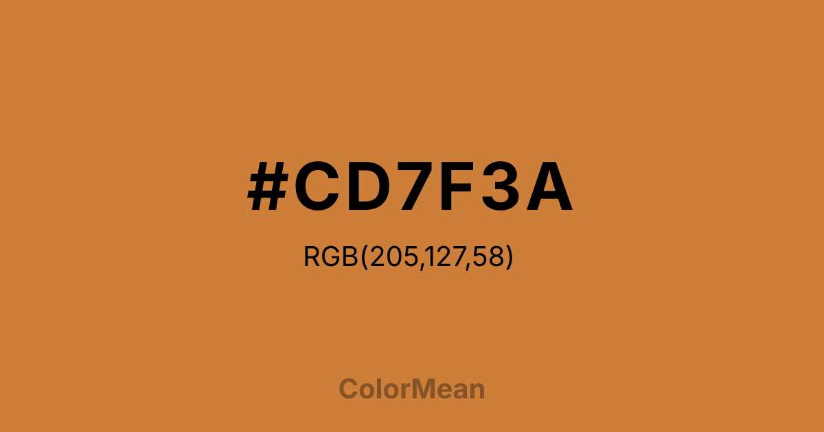 #CD7F3A RGB value is (205, 127, 58). The hex color red value is 205, green is 127, and blue is 58. Its HSL format shows a hue of 28°, saturation of 60 percent, and lightness of 52 percent. The CMYK process values are 0 percent, 38 percent, 72 percent, 20 percent.