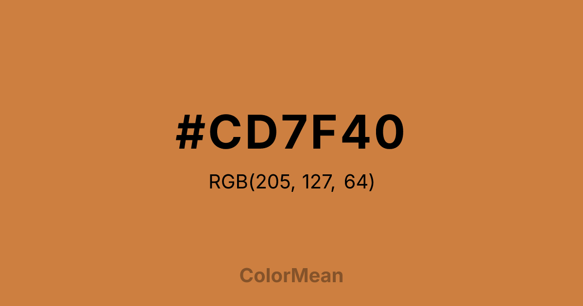 #CD7F40 RGB value is (205, 127, 64). The hex color red value is 205, green is 127, and blue is 64. Its HSL format shows a hue of 27°, saturation of 59 percent, and lightness of 53 percent. The CMYK process values are 0 percent, 38 percent, 69 percent, 20 percent.
