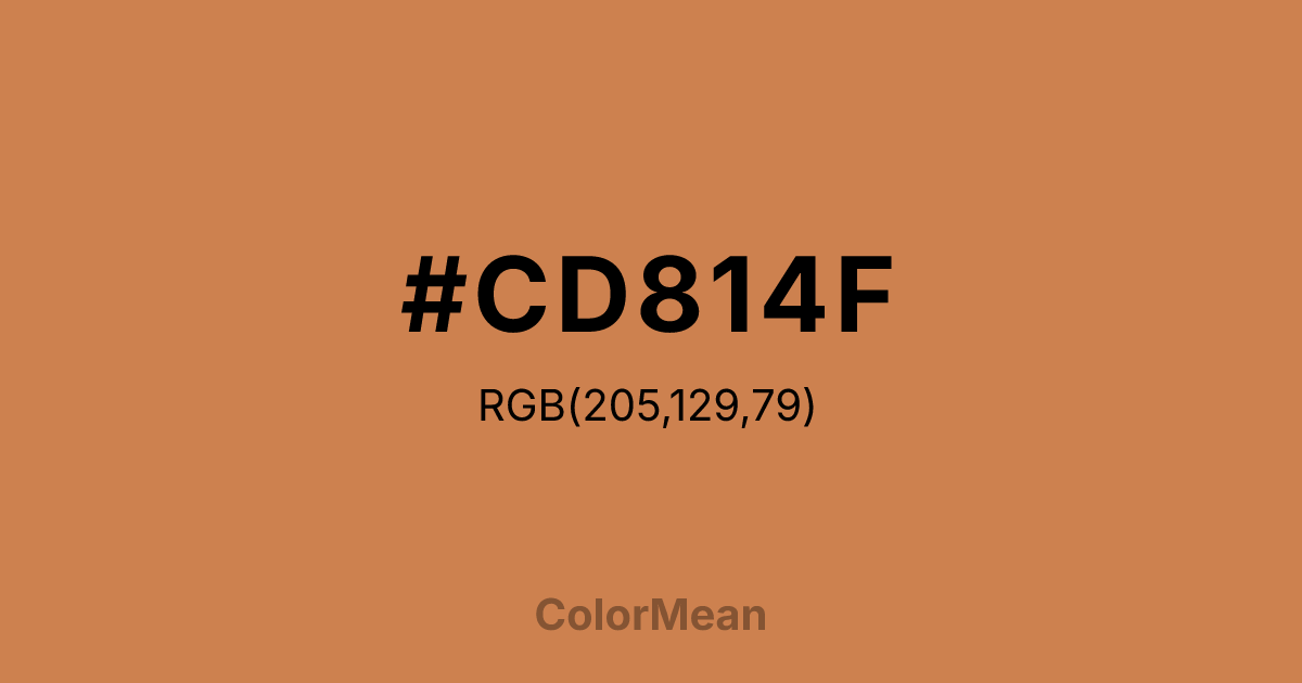 #CD814F RGB value is (205, 129, 79). The hex color red value is 205, green is 129, and blue is 79. Its HSL format shows a hue of 24°, saturation of 56 percent, and lightness of 56 percent. The CMYK process values are 0 percent, 37 percent, 61 percent, 20 percent.