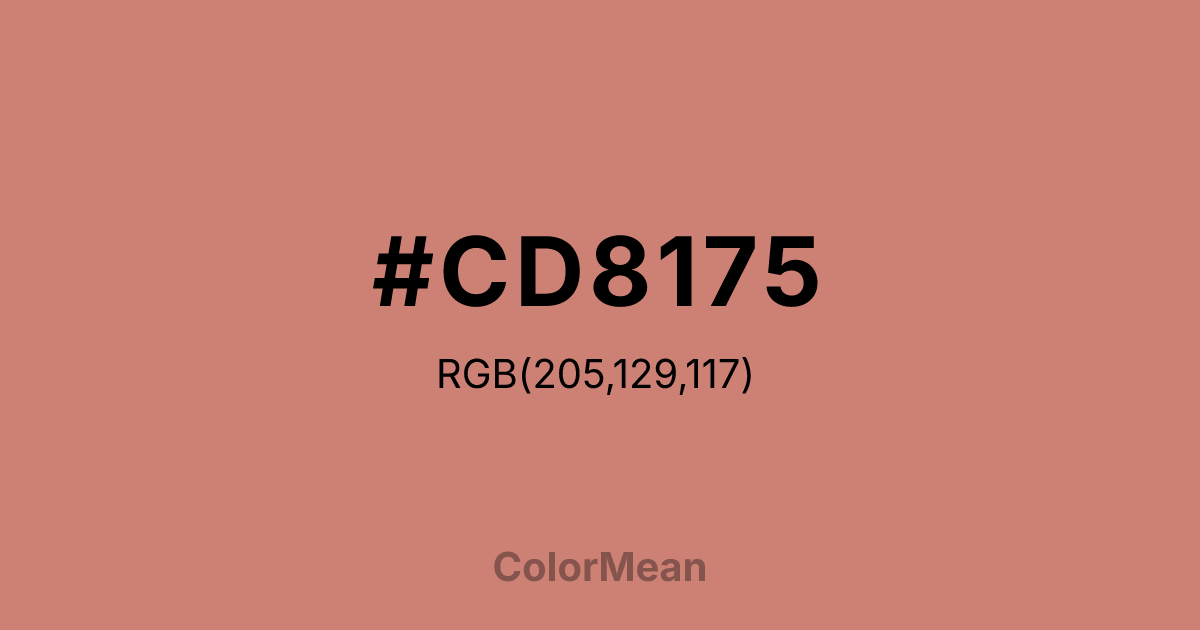 #CD8175 RGB value is (205, 129, 117). The hex color red value is 205, green is 129, and blue is 117. Its HSL format shows a hue of 8°, saturation of 47 percent, and lightness of 63 percent. The CMYK process values are 0 percent, 37 percent, 43 percent, 20 percent.