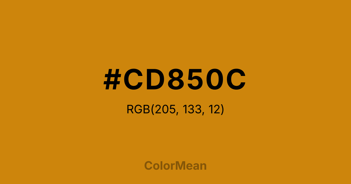#CD850C RGB value is (205, 133, 12). The hex color red value is 205, green is 133, and blue is 12. Its HSL format shows a hue of 38°, saturation of 89 percent, and lightness of 43 percent. The CMYK process values are 0 percent, 35 percent, 94 percent, 20 percent.