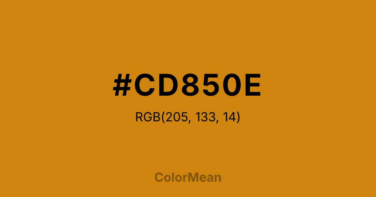 #CD850E RGB value is (205, 133, 14). The hex color red value is 205, green is 133, and blue is 14. Its HSL format shows a hue of 37°, saturation of 87 percent, and lightness of 43 percent. The CMYK process values are 0 percent, 35 percent, 93 percent, 20 percent.