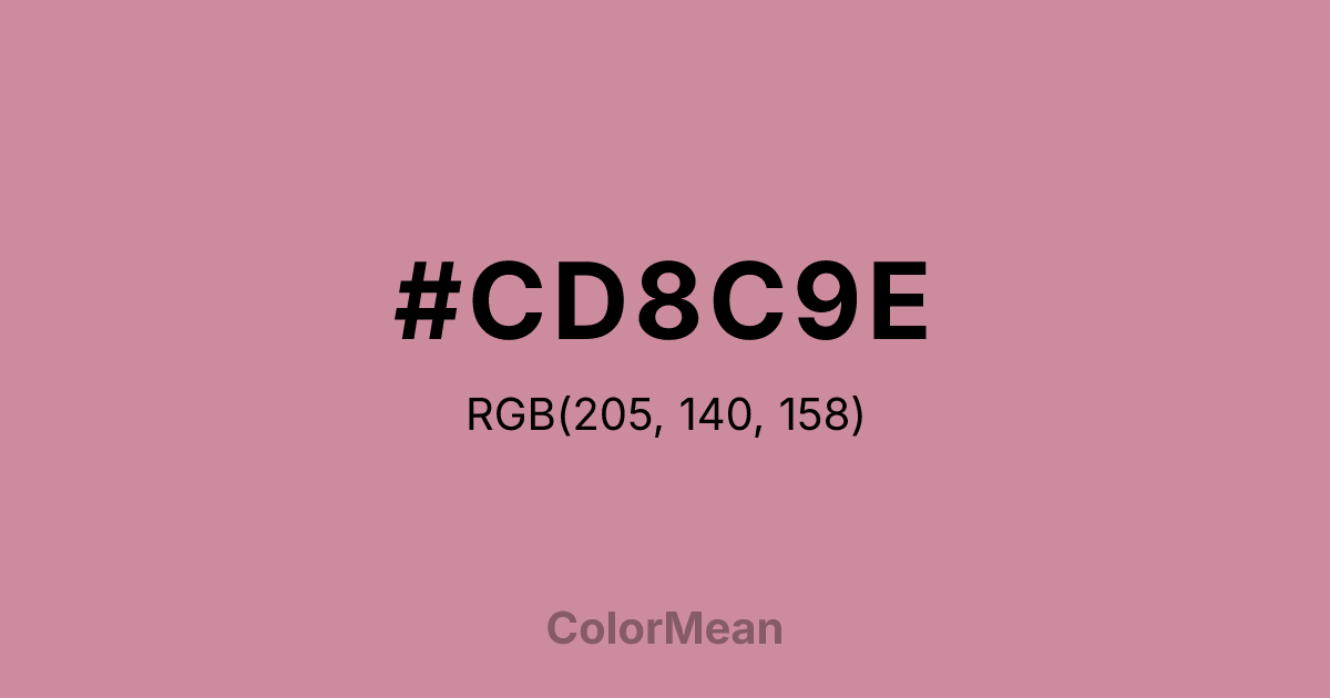 #CD8C9E RGB value is (205, 140, 158). The hex color red value is 205, green is 140, and blue is 158. Its HSL format shows a hue of 343°, saturation of 39 percent, and lightness of 68 percent. The CMYK process values are 0 percent, 32 percent, 23 percent, 20 percent.