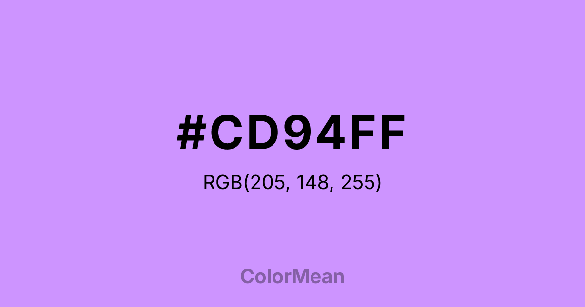 #CD94FF RGB value is (205, 148, 255). The hex color red value is 205, green is 148, and blue is 255. Its HSL format shows a hue of 272°, saturation of 100 percent, and lightness of 79 percent. The CMYK process values are 20 percent, 42 percent, 0 percent, 0 percent.
