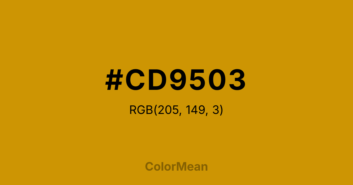 #CD9503 RGB value is (205, 149, 3). The hex color red value is 205, green is 149, and blue is 3. Its HSL format shows a hue of 43°, saturation of 97 percent, and lightness of 41 percent. The CMYK process values are 0 percent, 27 percent, 99 percent, 20 percent.