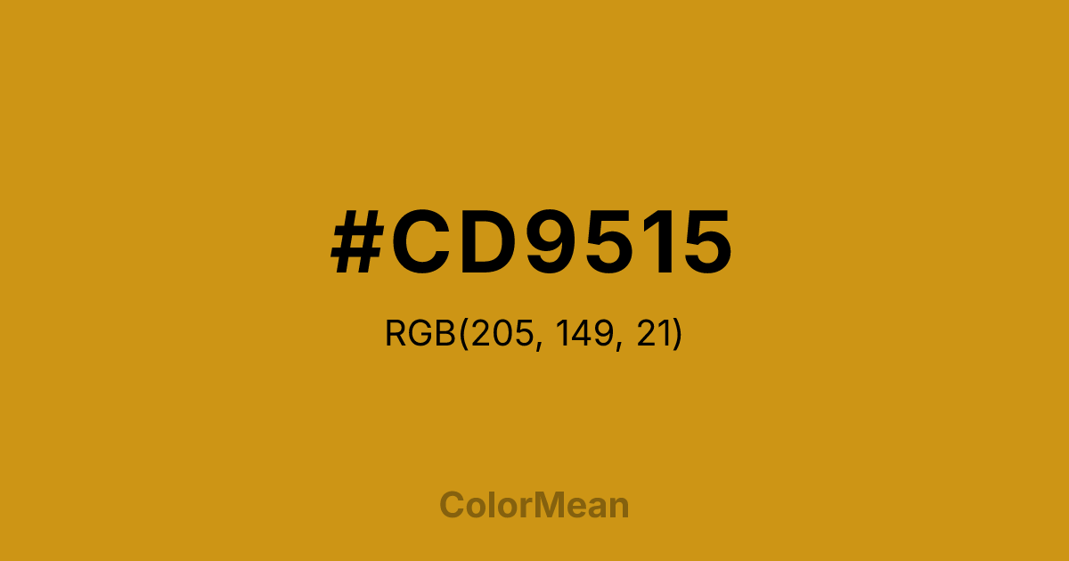 #CD9515 RGB value is (205, 149, 21). The hex color red value is 205, green is 149, and blue is 21. Its HSL format shows a hue of 42°, saturation of 81 percent, and lightness of 44 percent. The CMYK process values are 0 percent, 27 percent, 90 percent, 20 percent.