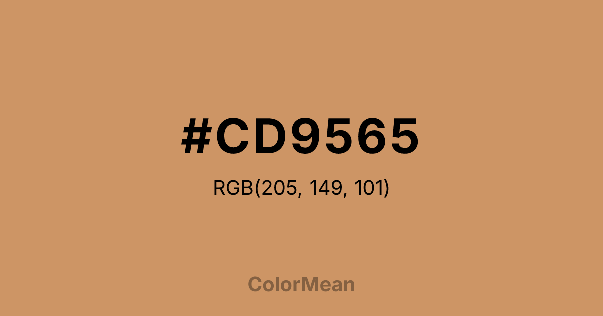 #CD9565 RGB value is (205, 149, 101). The hex color red value is 205, green is 149, and blue is 101. Its HSL format shows a hue of 28°, saturation of 51 percent, and lightness of 60 percent. The CMYK process values are 0 percent, 27 percent, 51 percent, 20 percent.