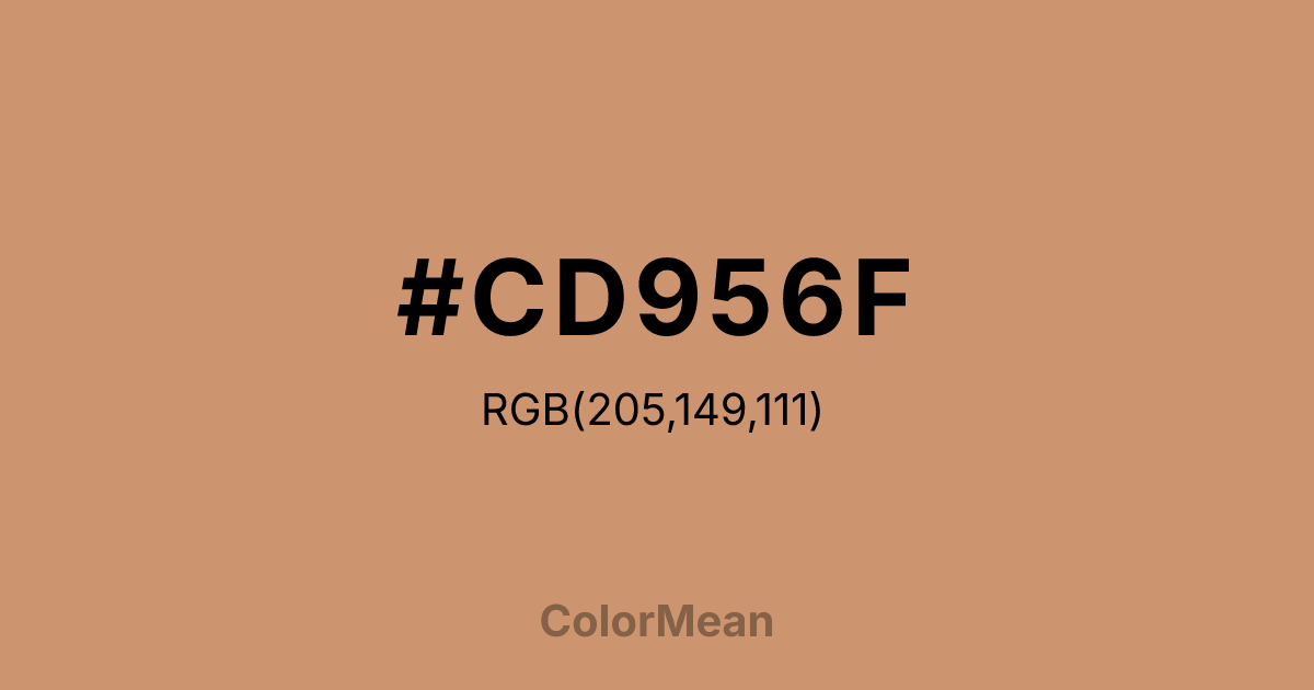 #CD956F RGB value is (205, 149, 111). The hex color red value is 205, green is 149, and blue is 111. Its HSL format shows a hue of 24°, saturation of 48 percent, and lightness of 62 percent. The CMYK process values are 0 percent, 27 percent, 46 percent, 20 percent.