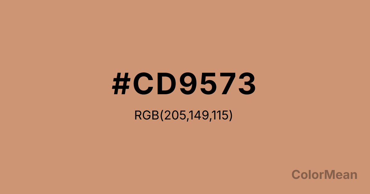 #CD9573 RGB value is (205, 149, 115). The hex color red value is 205, green is 149, and blue is 115. Its HSL format shows a hue of 23°, saturation of 47 percent, and lightness of 63 percent. The CMYK process values are 0 percent, 27 percent, 44 percent, 20 percent.