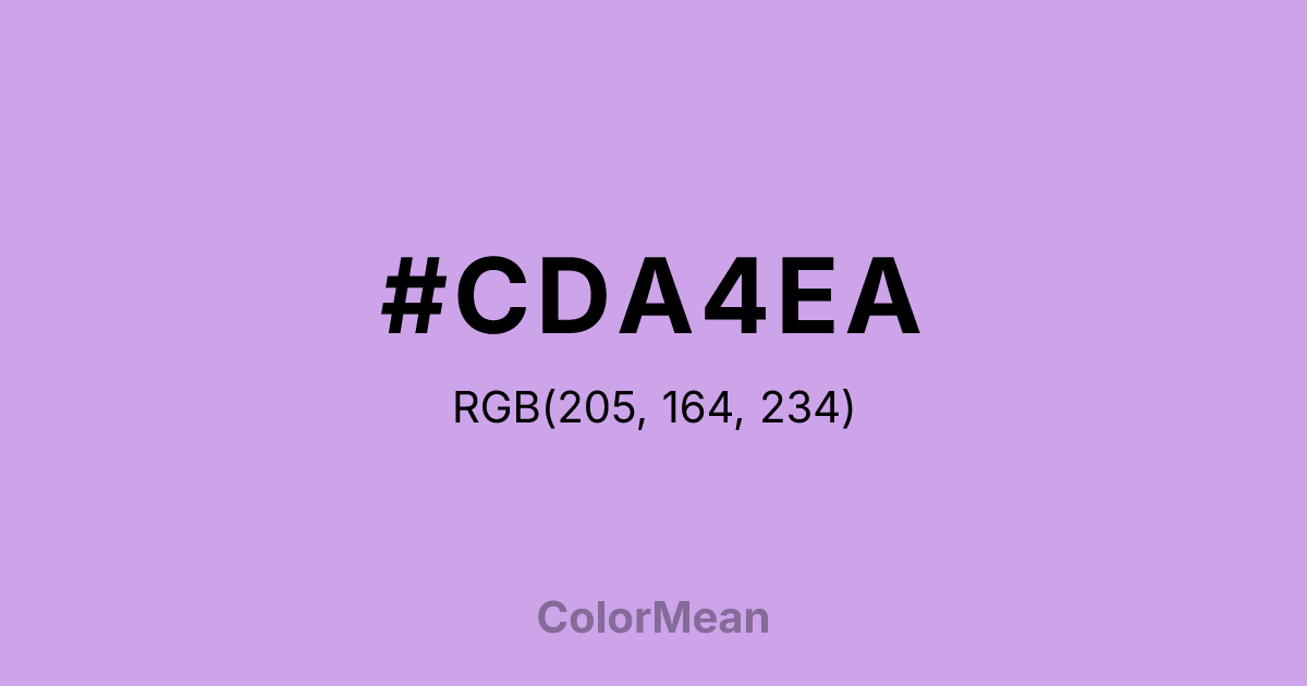 #CDA4EA RGB value is (205, 164, 234). The hex color red value is 205, green is 164, and blue is 234. Its HSL format shows a hue of 275°, saturation of 62 percent, and lightness of 78 percent. The CMYK process values are 12 percent, 30 percent, 0 percent, 8 percent.