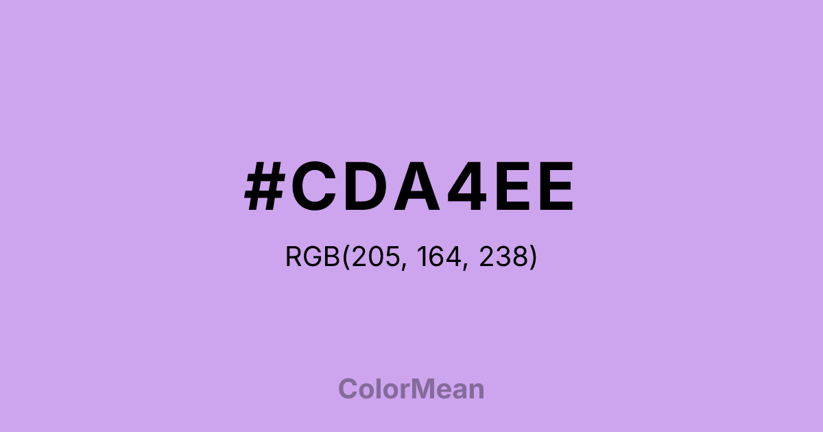 #CDA4EE RGB value is (205, 164, 238). The hex color red value is 205, green is 164, and blue is 238. Its HSL format shows a hue of 273°, saturation of 69 percent, and lightness of 79 percent. The CMYK process values are 14 percent, 31 percent, 0 percent, 7 percent.