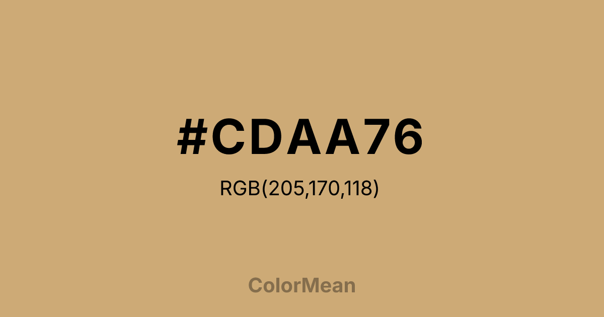 #CDAA76 RGB value is (205, 170, 118). The hex color red value is 205, green is 170, and blue is 118. Its HSL format shows a hue of 36°, saturation of 47 percent, and lightness of 63 percent. The CMYK process values are 0 percent, 17 percent, 42 percent, 20 percent.
