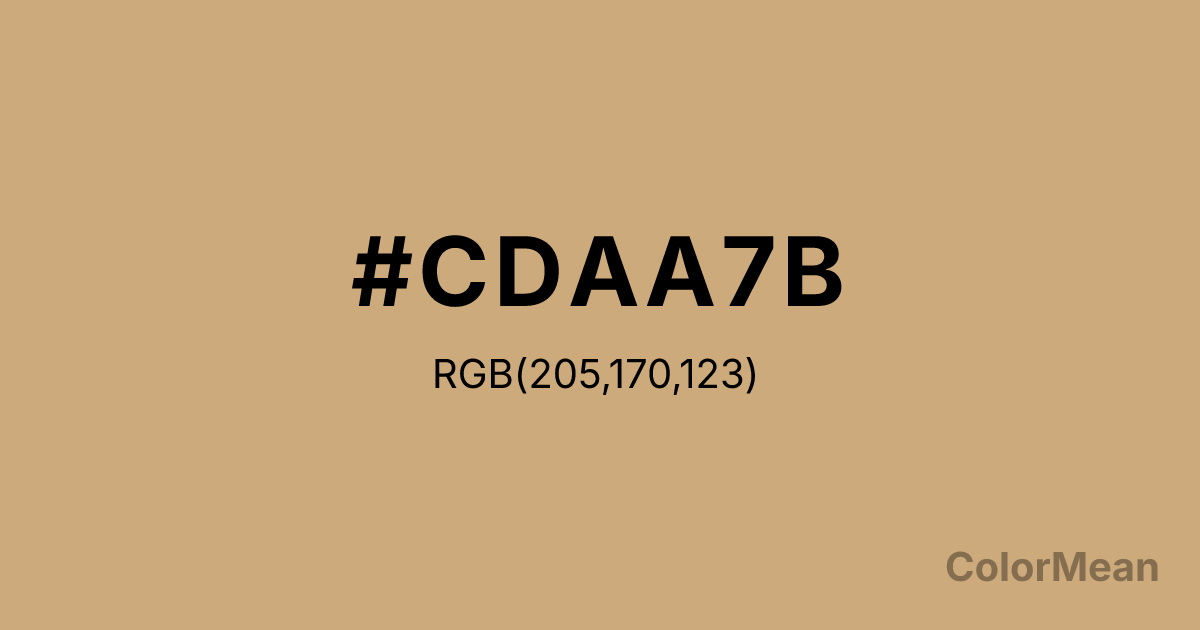 #CDAA7B RGB value is (205, 170, 123). The hex color red value is 205, green is 170, and blue is 123. Its HSL format shows a hue of 34°, saturation of 45 percent, and lightness of 64 percent. The CMYK process values are 0 percent, 17 percent, 40 percent, 20 percent.