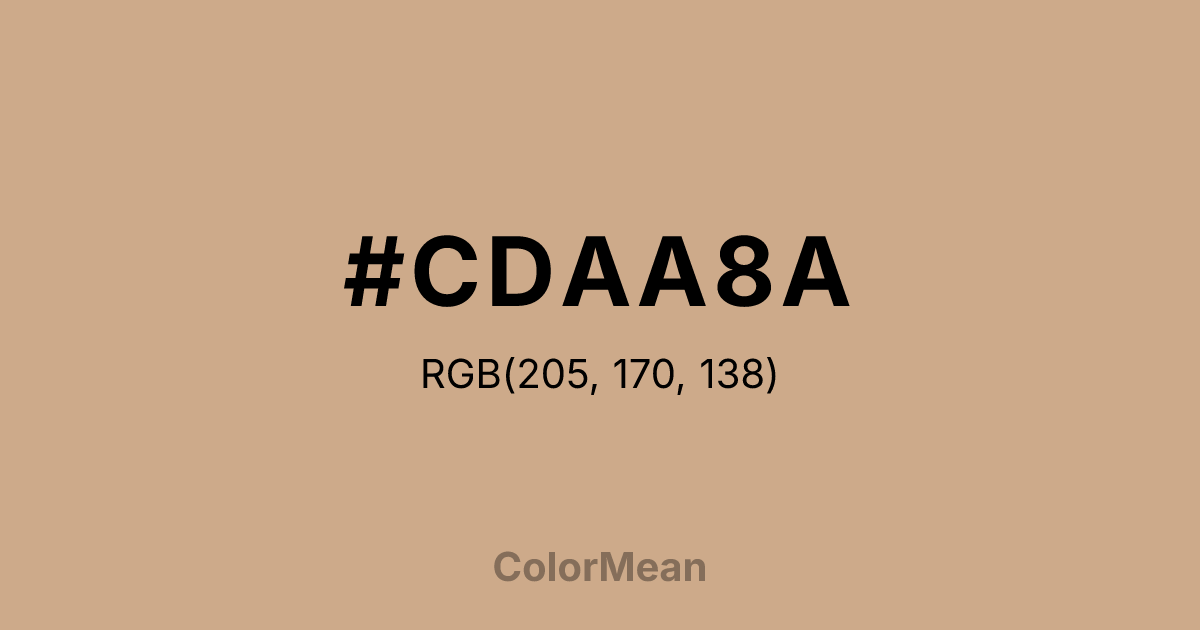 #CDAA8A RGB value is (205, 170, 138). The hex color red value is 205, green is 170, and blue is 138. Its HSL format shows a hue of 29°, saturation of 40 percent, and lightness of 67 percent. The CMYK process values are 0 percent, 17 percent, 33 percent, 20 percent.