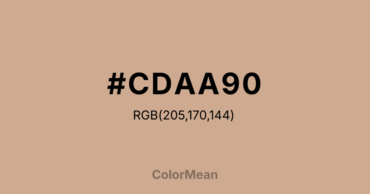 #CDAA90 RGB value is (205, 170, 144). The hex color red value is 205, green is 170, and blue is 144. Its HSL format shows a hue of 26°, saturation of 38 percent, and lightness of 68 percent. The CMYK process values are 0 percent, 17 percent, 30 percent, 20 percent.